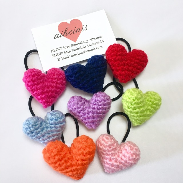 毛糸で編んだぷっくりハートのヘアゴムです。 大 約7.5×6.5cm→¥500 小 約4.5×4cm→¥300 アクリル100%の毛糸を使用しているため、どの色も発色鮮やかで可愛いです♡ 写真にないお色もオーダー可能です☆