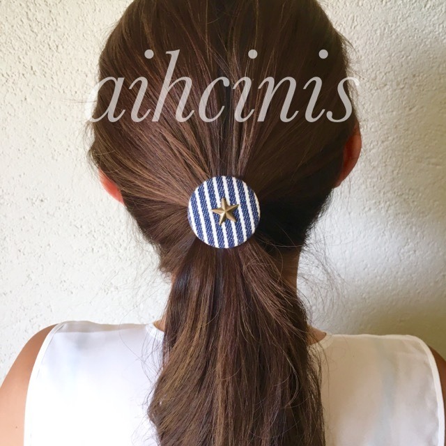 ストライプのデニムとアンティークゴールドの星スタッズがクールな印象 カジュアルスタイルにマッチするくるみボタンヘアゴムです。 親子でお揃いコーデにも最適 size: Large 直径約38mm Small 直径約27mm 各1点 ¥400- L.S2点セット ¥700