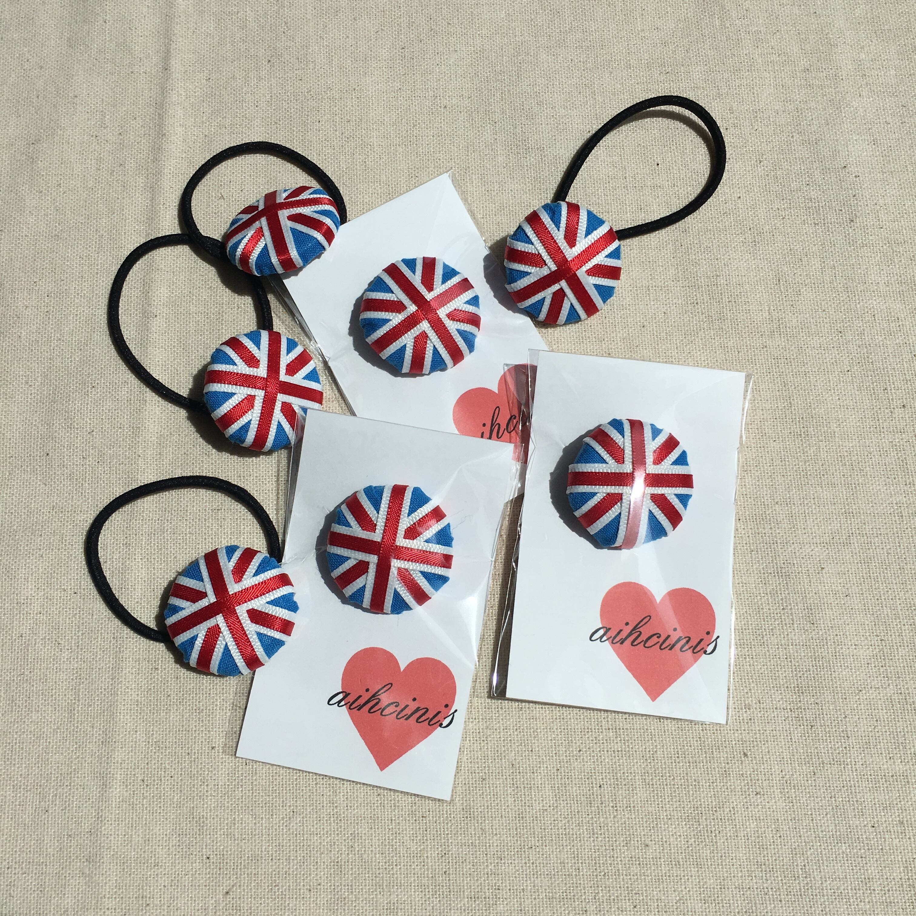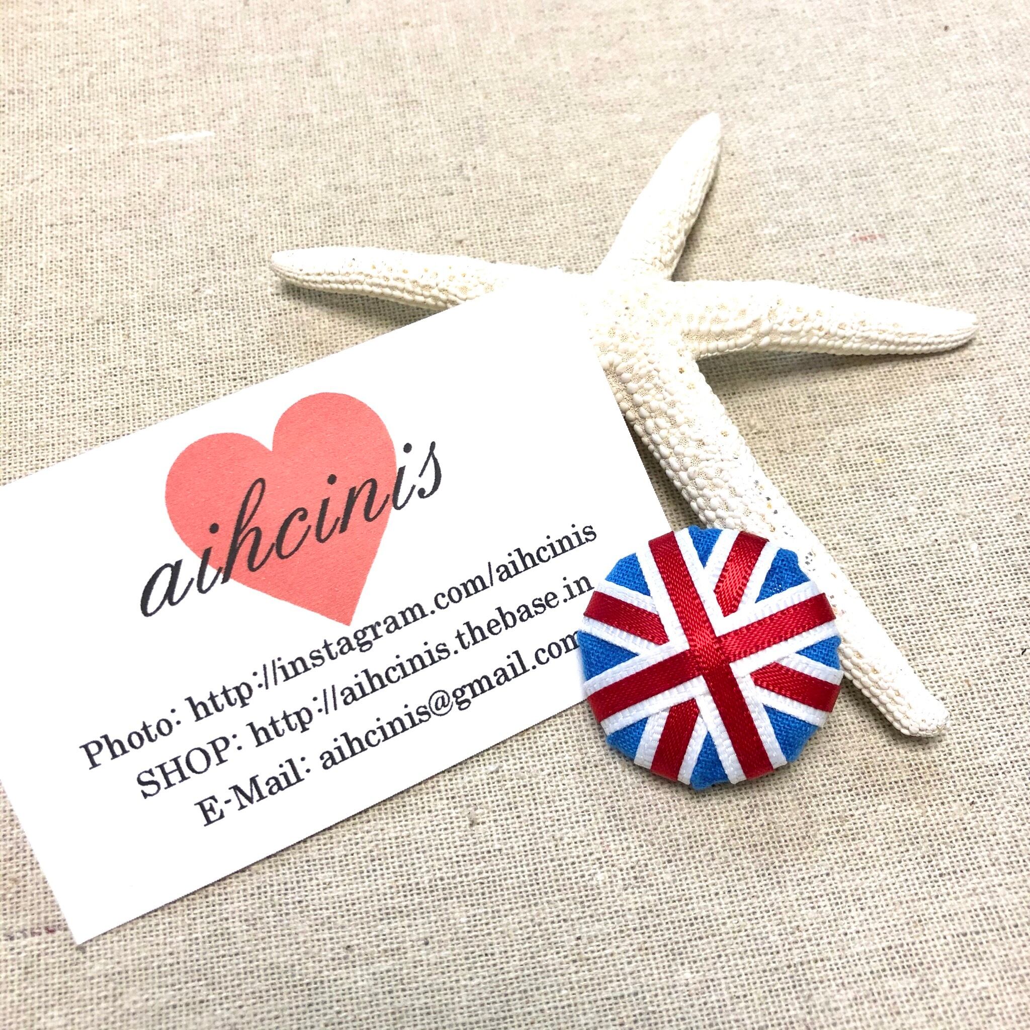 一本一本丁寧にリボンを重ねて作ったユニオンジャック柄のくるみボタン☆ マグネットと、別売りのヘアゴムとの2パターンでのご用意です size: 直径約3.3cm