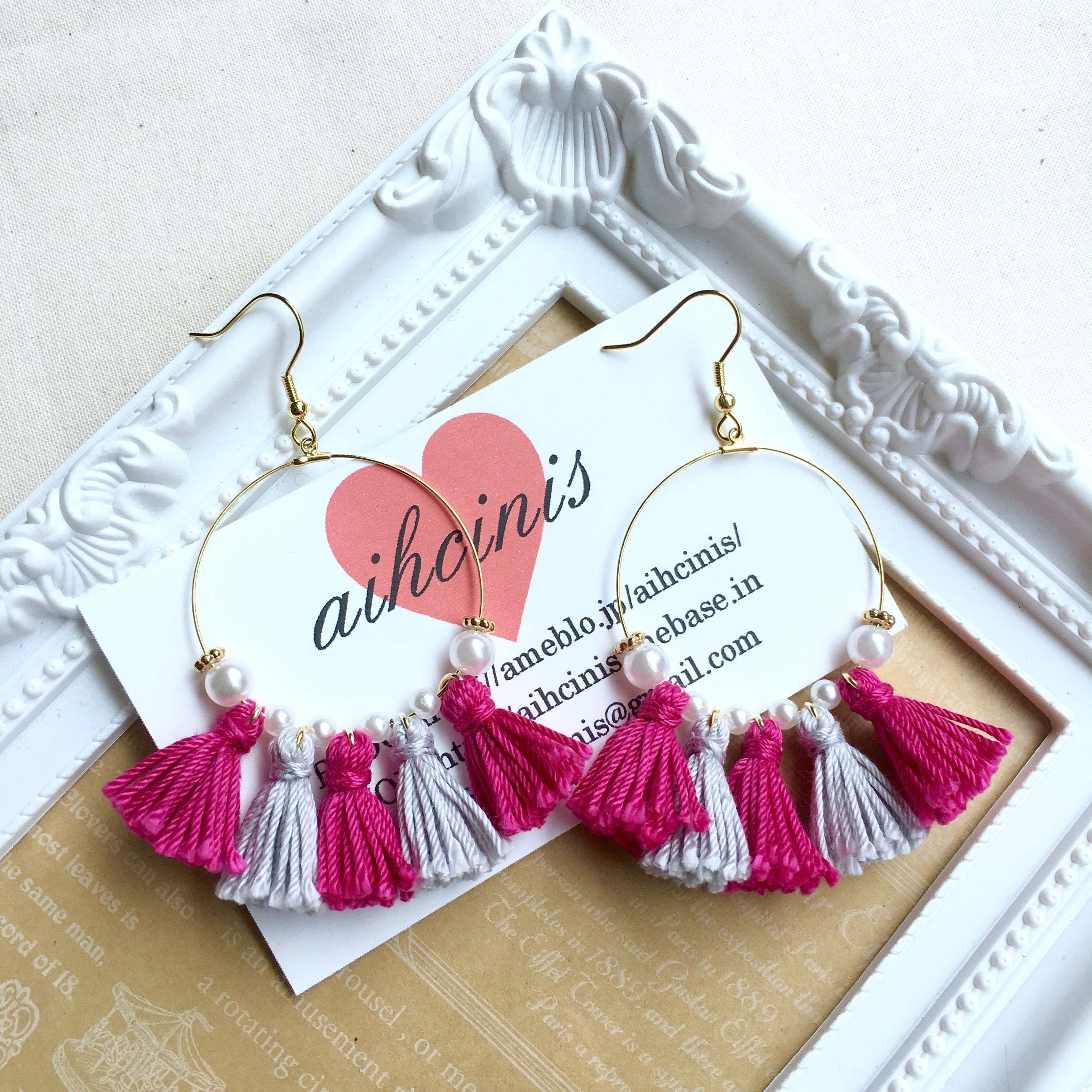 ピンク×グレーという女子にはたまらないカラーの5連のミニタッセルと、小粒パールの組み合わせ☆