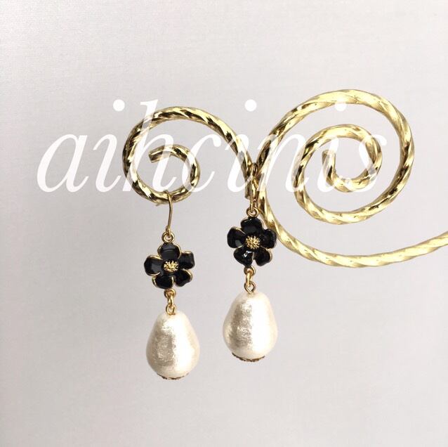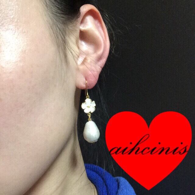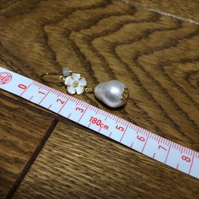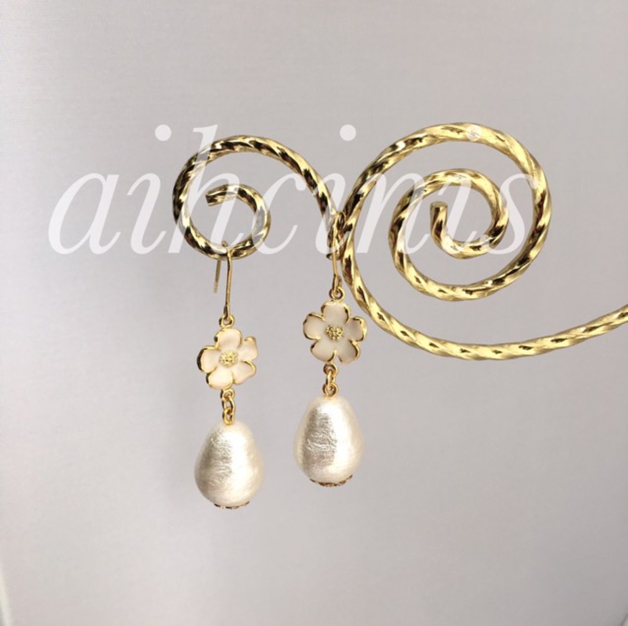 お花白×コットンパール×ゴールド 女子なら思わず手に取ってしまう組み合わせ♡ size: 全長約4.5cm イヤリング 100円 樹脂ピアス 50円