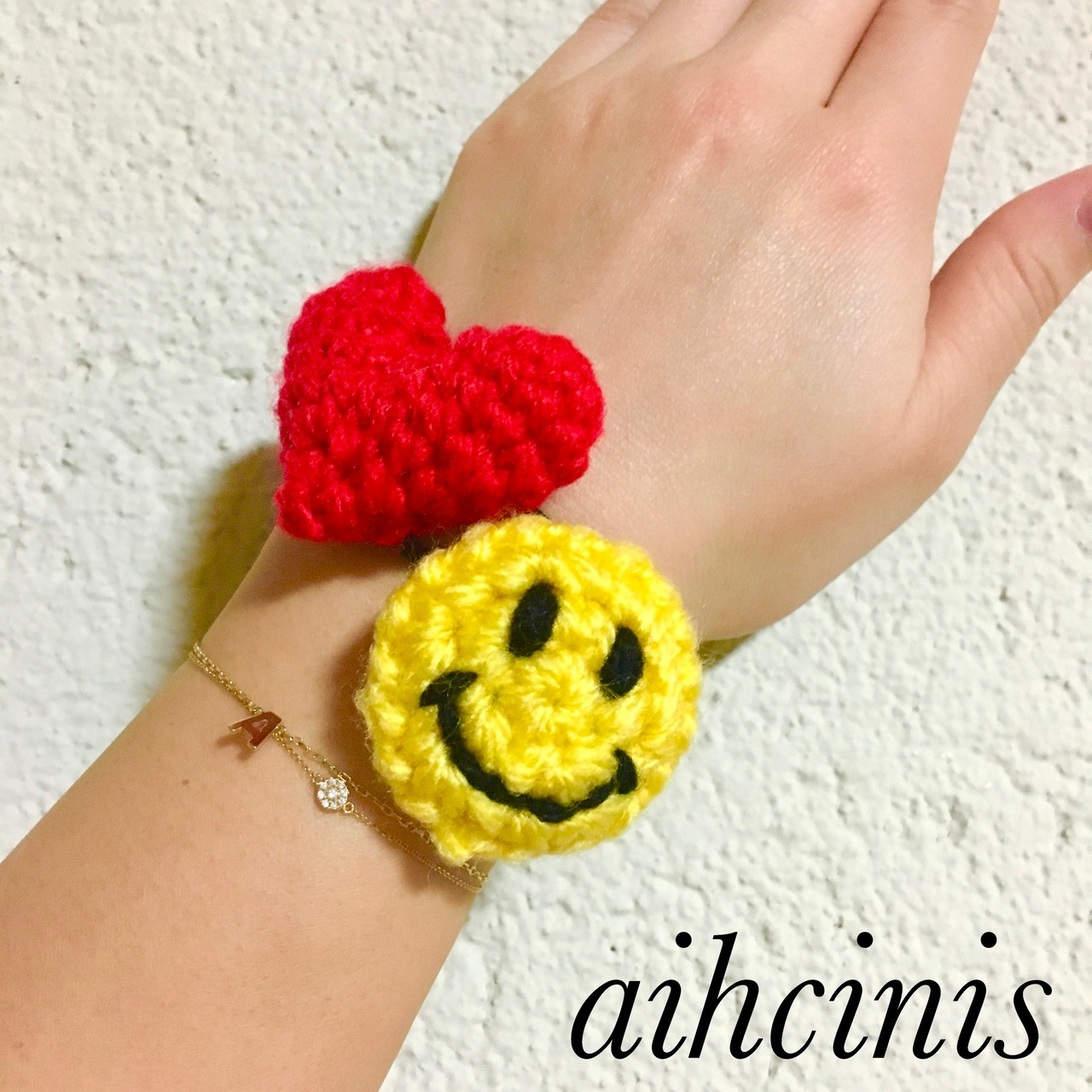 毛糸で編んだぷっくりハートのヘアゴムです。